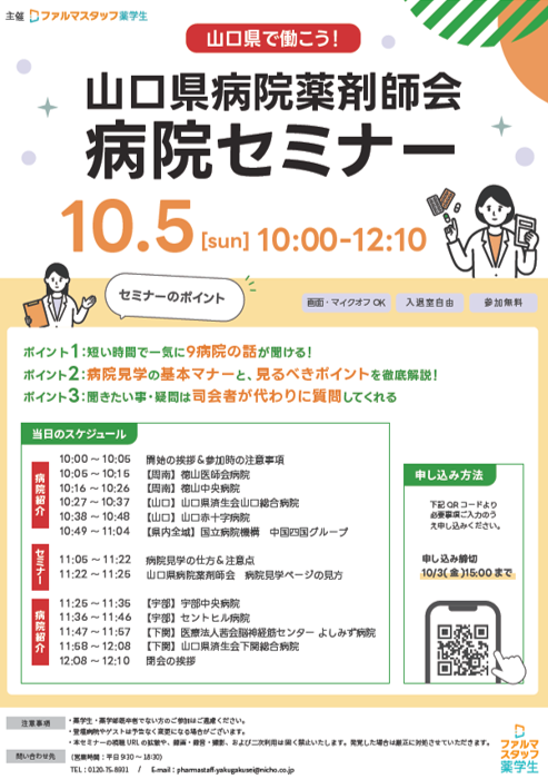長門・萩 | 随時 (応相談) | 山口県厚生農業協同組合連合会 長門総合病院 | ※HP内「お問い合わせ入力フォーム」に薬剤科見学希望の旨記入 | 高田英之 | 0837-22-2220 | 薬学部生、既卒者 | 随時 | 2025年8月~ | ||